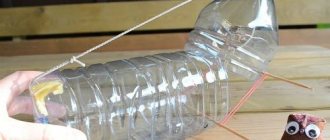A tunnel is made from a plastic (liter) bottle by cutting off the neck and bottom. A rod (stick) is pierced through the resulting “apparatus,” the length of which should cover the diameter of a bucket half filled with water. This mousetrap works very simply: the rodent climbs onto a stick and a bottle. Under the weight of the rodent, the plastic tunnel rotates and the animal falls into the bucket.
