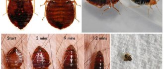 Household (bed) bugs are small insects that feed exclusively on blood. Before saturation, their size is 3–5 mm. They have a round shape and light color. After eating they stretch out and become up to 8 mm. The color of their bodies becomes more saturated, sometimes burgundy. At this time they are more vulnerable. They are easy to crush. Bedbugs can drink up to twice their weight in blood. Bedbug larvae have the property of enlarging and turning red-brown.