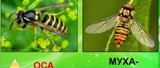 - Полосатая желто-черная сирфида, или журчалка, двукрылое, внешним видом похожее на осу, ест цветочный нектар.